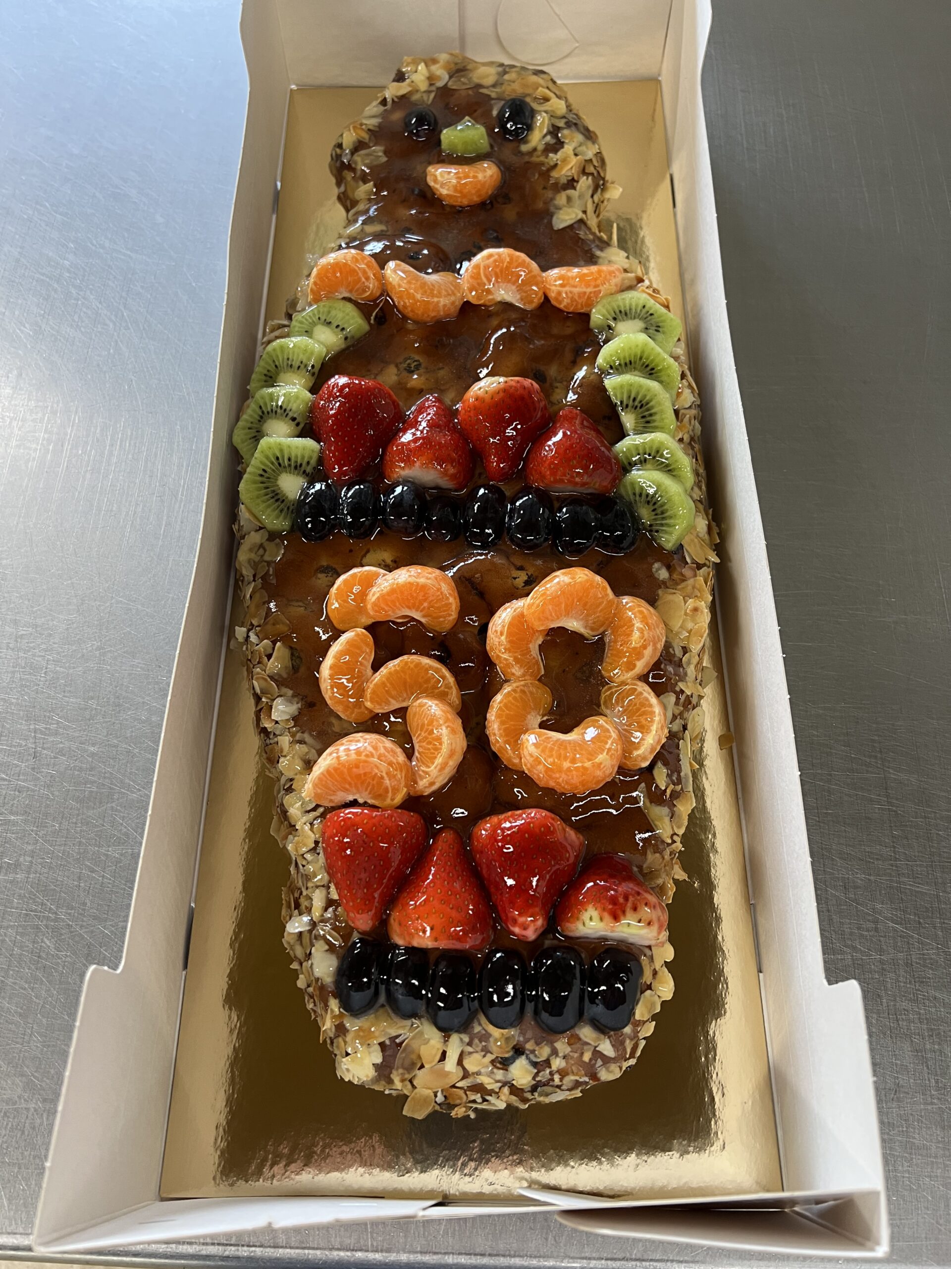De vulling bestaat royaal uit krenten en rozijnen en bovenop wordt ons abrahams krentenbrood gedecoreerd met o.a. vers fruit.
