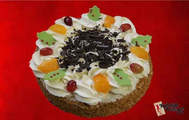 De kerst slagroomtaart wordt tweemaal gevuld met slagroom en in kerststijl gedecoreerd door onze banketbakkers.