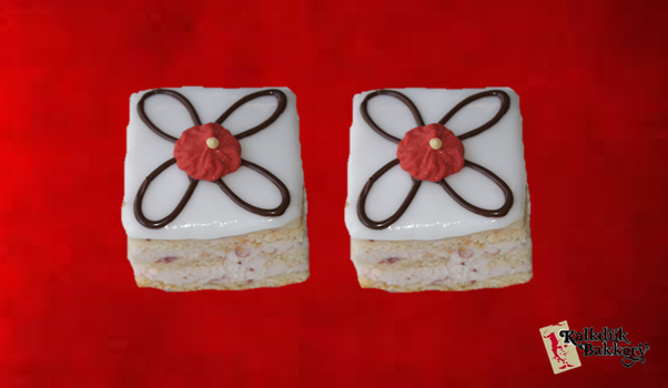 De luxe kerst petit four is een heerlijk luxe gebakje. Kapsel gevuld met heerlijke zachte aardbeien vulling, laagje marsepein en fondant gegarneerd met chocolade.