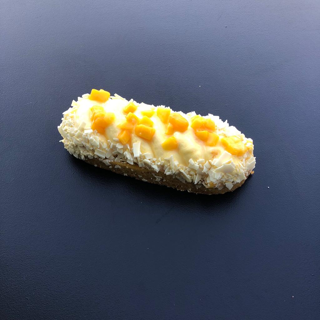 Gemaakt van ons bekende sloffendeeg. De slof is bedekt met heerlijk luchtige mangobavaroise met stukjes mango