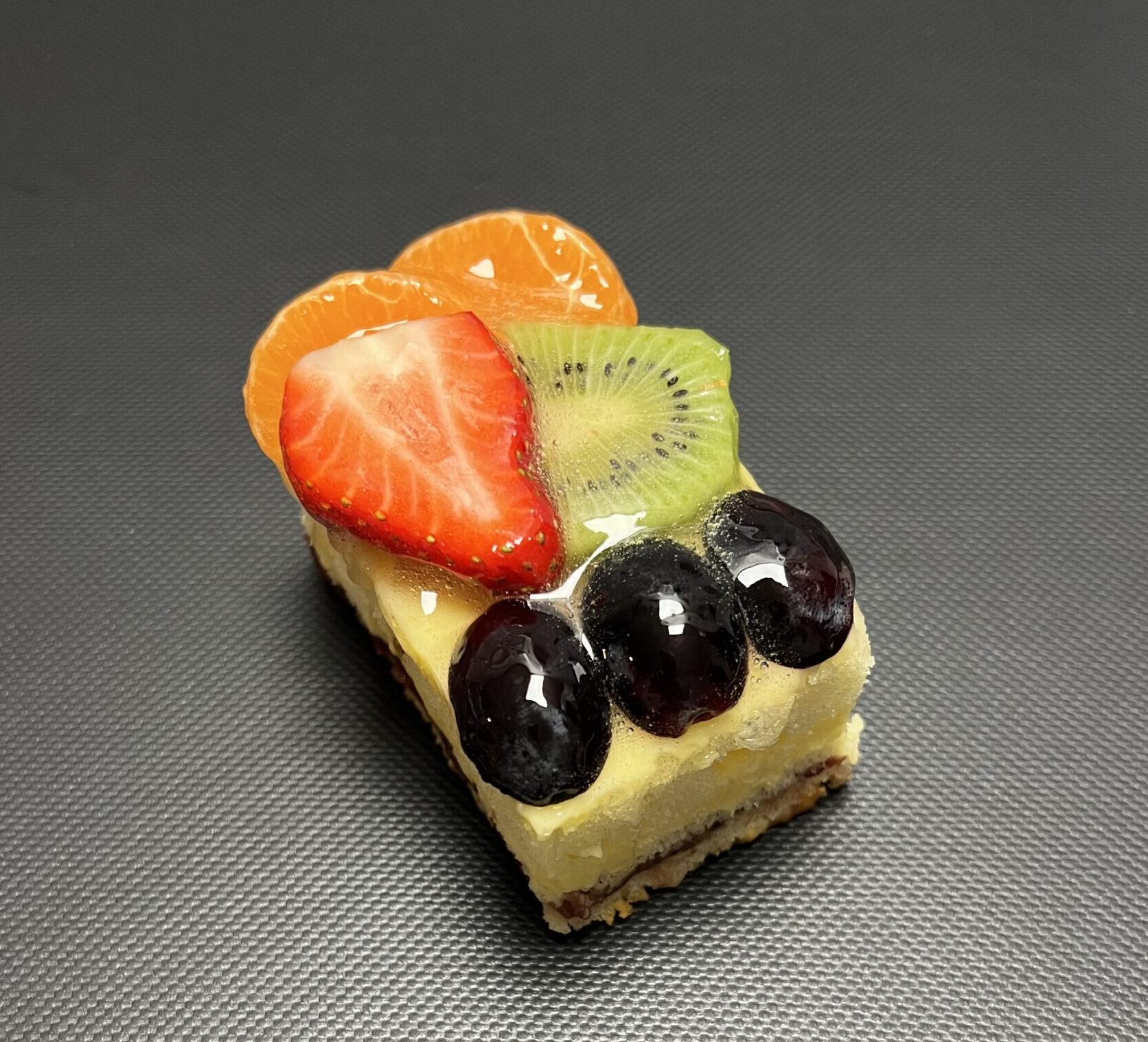 Het vruchten cake gebakje is gevuld met frambozenjam en Zwitserse room. en afgewerkt met zoveel mogelijk vers fruit.