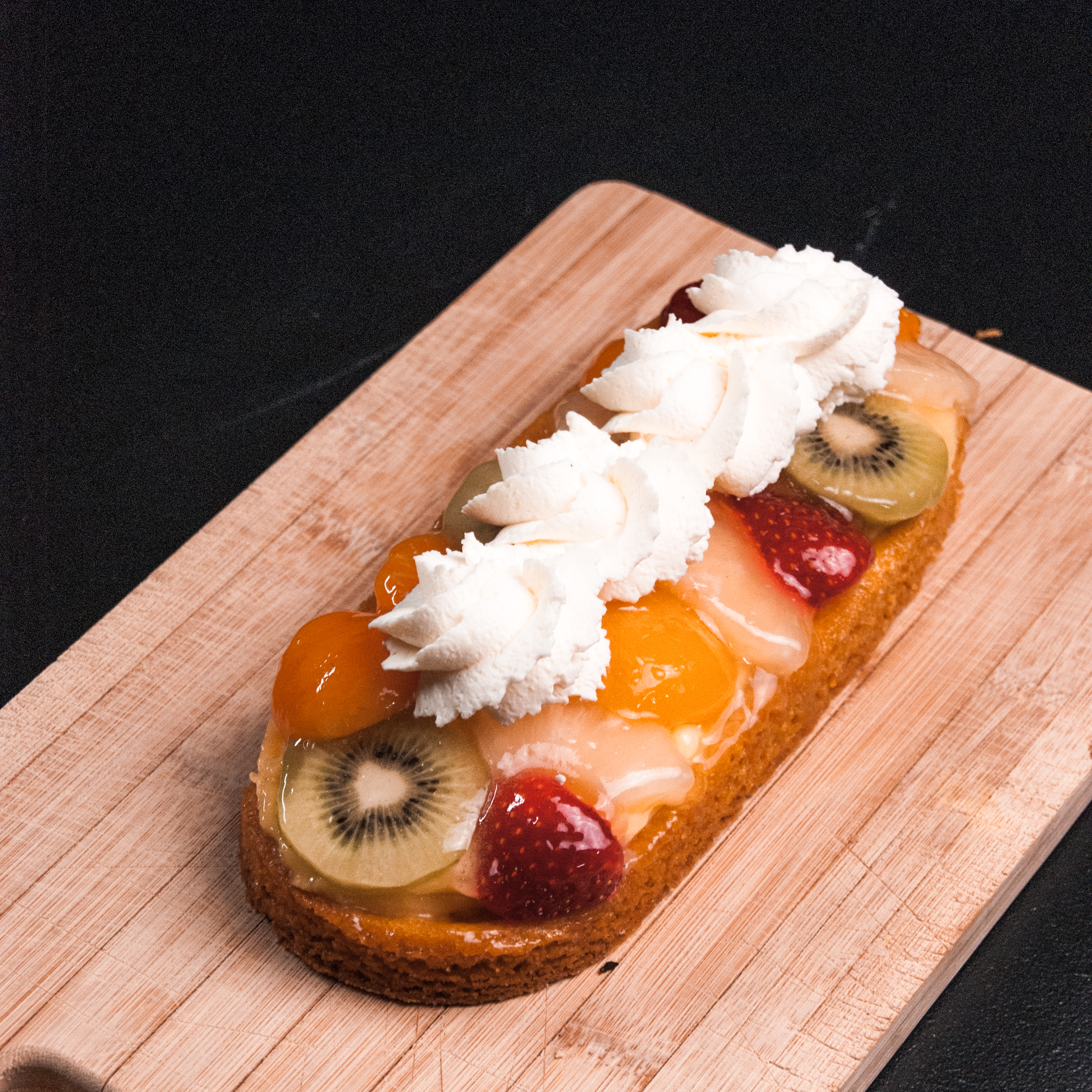 Gemaakt van ons bekende sloffendeeg. De slof is gevuld met zwitserseroom en wordt afgewerkt met verse vruchten en slagroom.